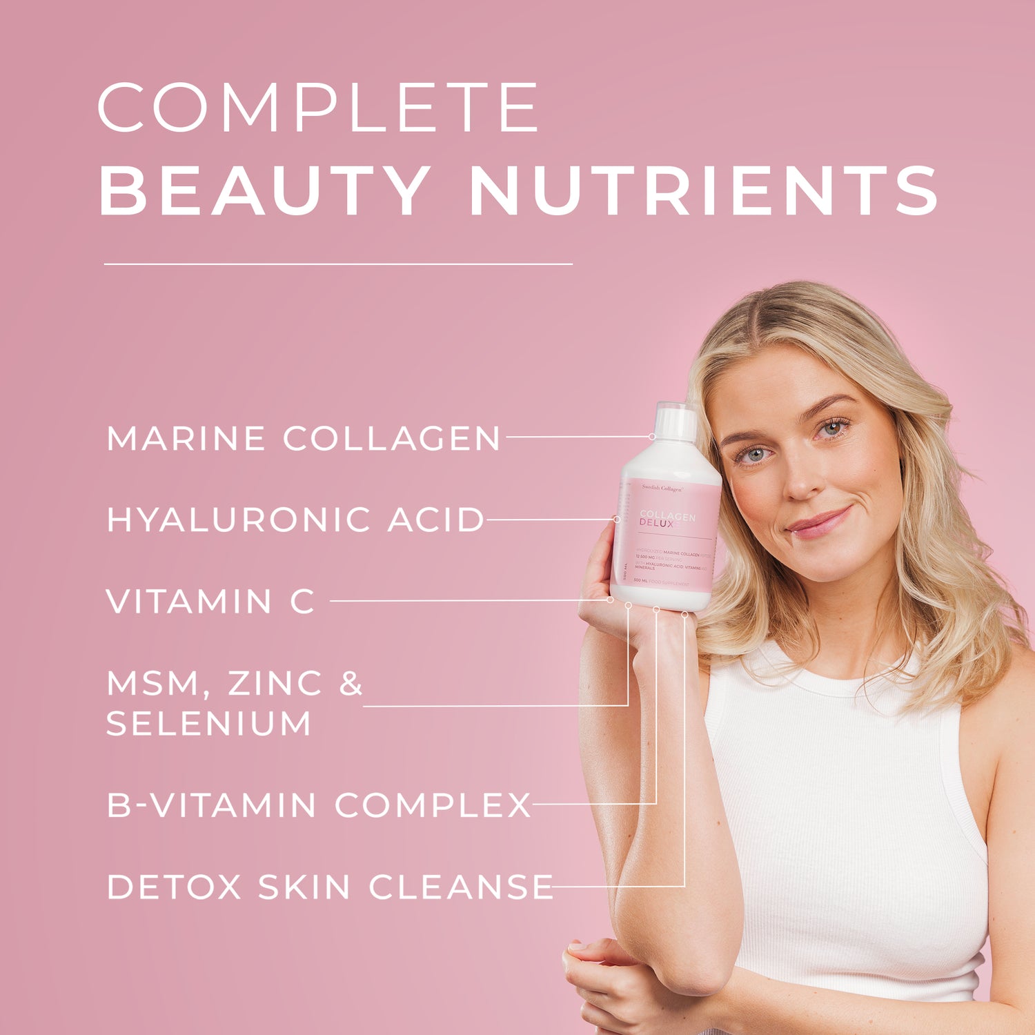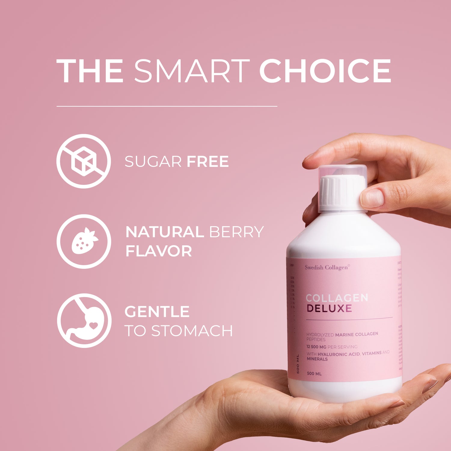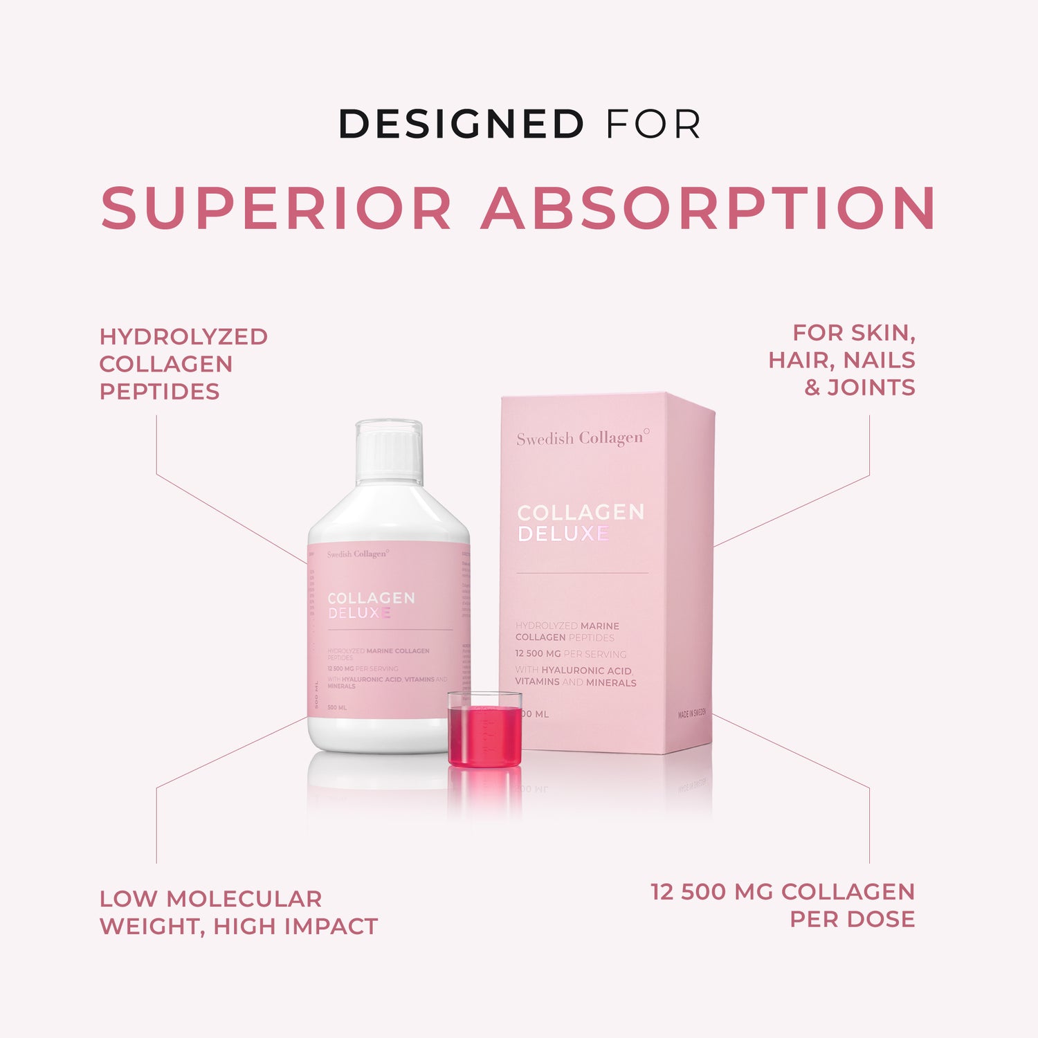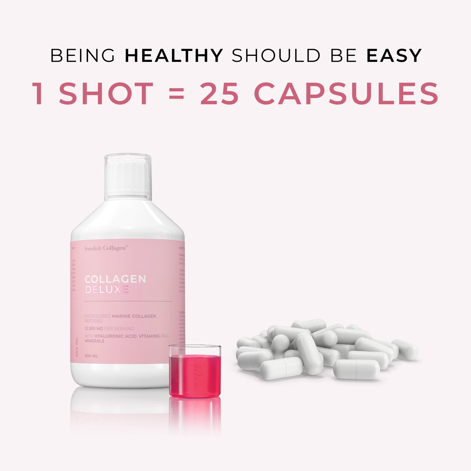 Til slutt får du alt i et deilig, ferdigdrikket bærshot som enkelt passer inn i din daglige rutine. Ingen blanding, ingen måling, ingen styr, bare en effektiv måte å øke kollagennivåene dine på. Det beste? Den er sukkerfri!