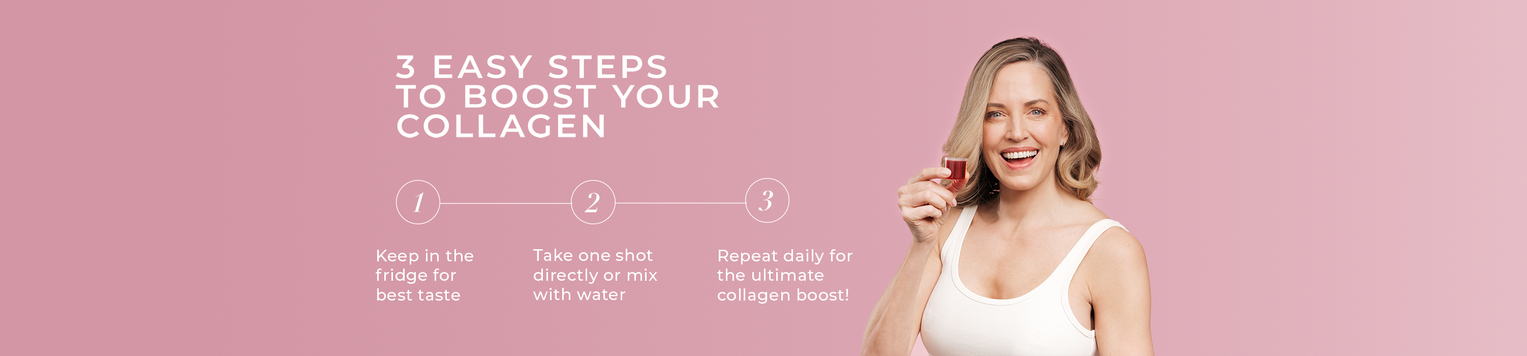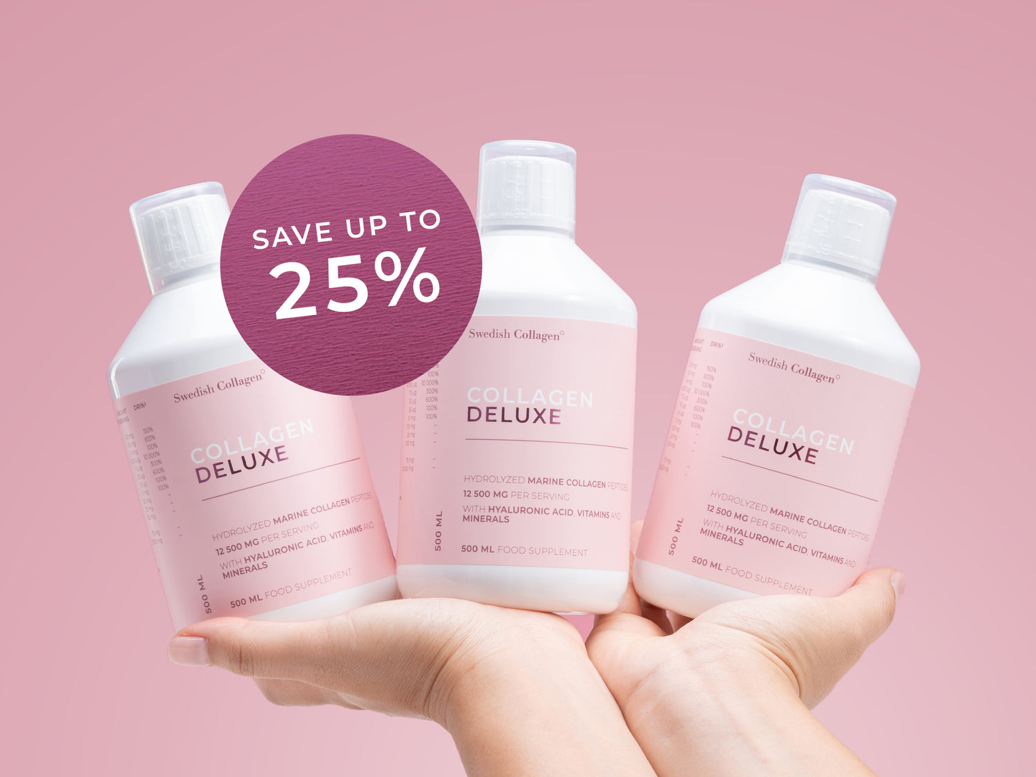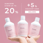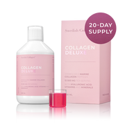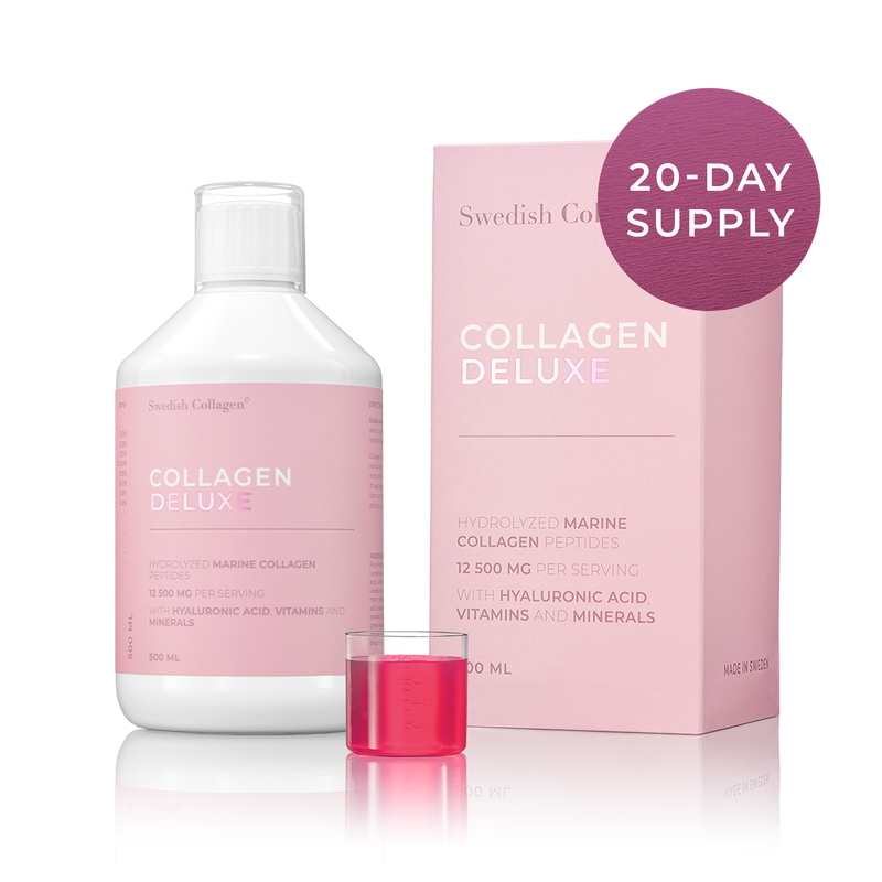 Å ta bare 25 ml Collagen Deluxe daglig bidrar til å fylle på kollagenet ditt, noe som gir deg glattere hud, sterkere hår og sunnere negler.