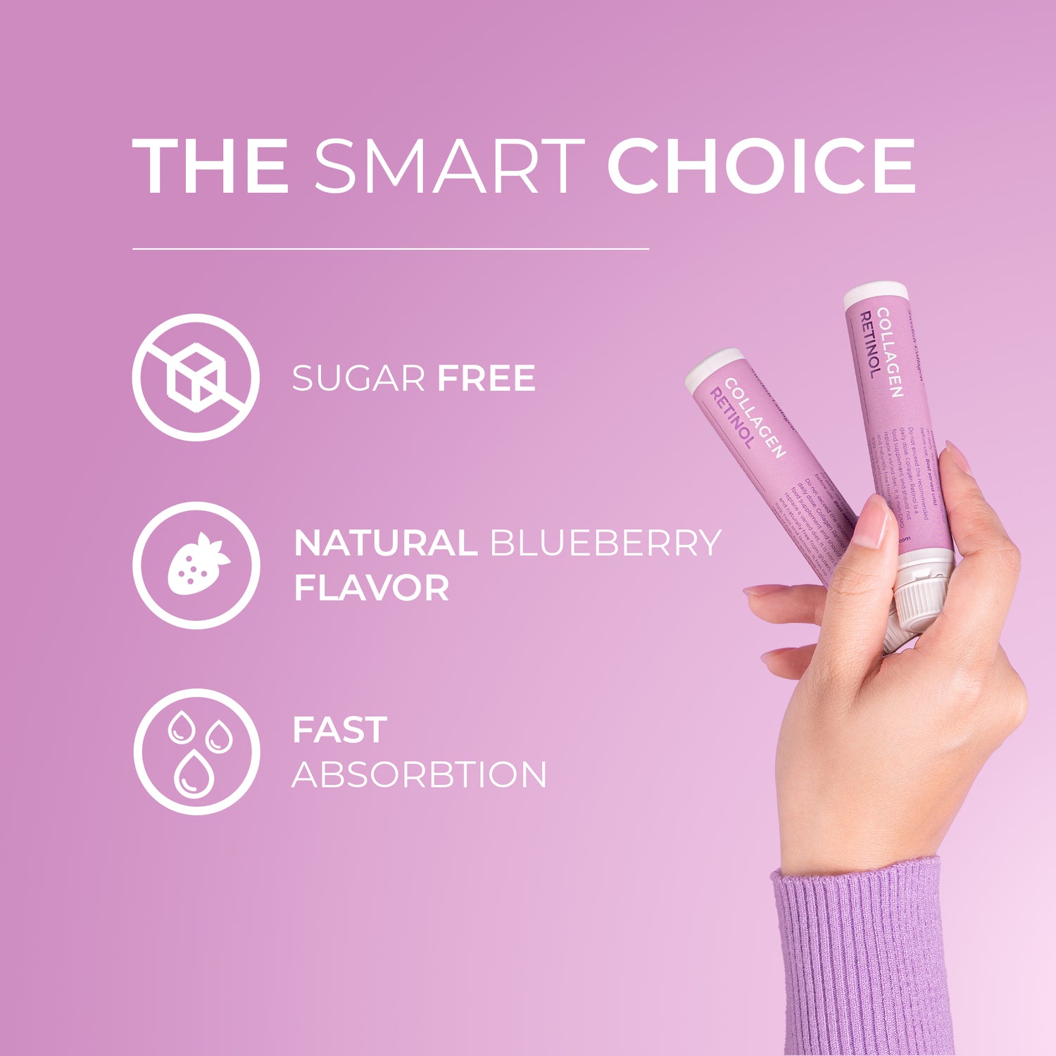 Nei. Hydrolyseprosessen eliminerer all smak eller lukt. I stedet har vår flytende kollagenretinol en deilig naturlig blåbærsmak.